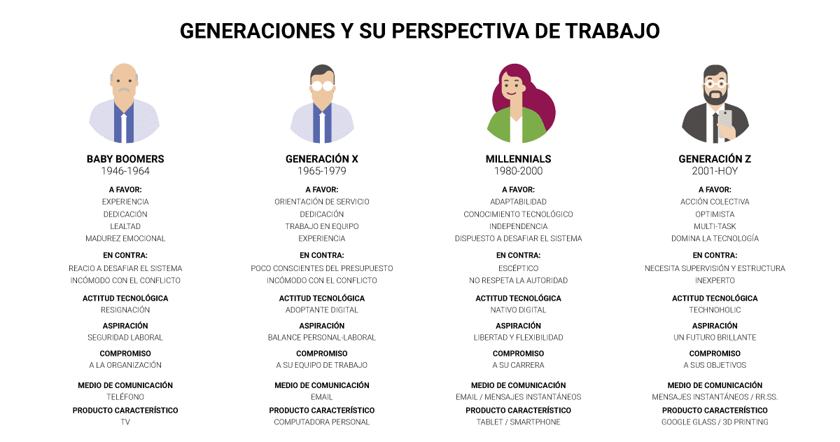 A continuación, te dejamos una infografía comparativa de las generaciones que te puedes encontrar en tu puesto de trabajo actual. El conocer sus características te puede llevar a convivir mejor con los que no pertenecen a tu generación y que las relaciones del equipo sean mejores.