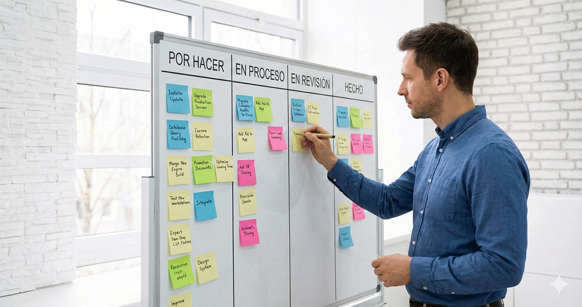 Kanban es un método que ayuda a los equipos a visualizar su trabajo, maximizar la eficiencia y mejorar continuamente. Se basa en un tablero dividido en columnas que representan las diferentes etapas del flujo de trabajo, como «Por hacer», «En progreso» y «Terminado». Las tareas se representan con tarjetas que se mueven a través de estas columnas a medida que avanzan.