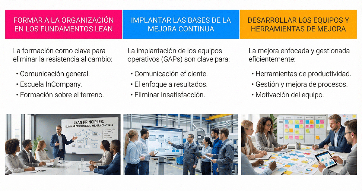 Como hemos visto lo primero es la formación, luego se implementan bases de mejora continua donde se determina cuáles son los indicadores, la organización, las rutas de comunicación, se establecen la gestión visual, los tableros con los indicadores (KPIs), si son digitalizados mucho mejor, y luego las propias herramientas de los equipos (5 S, matriz de polivalencias, etc.).