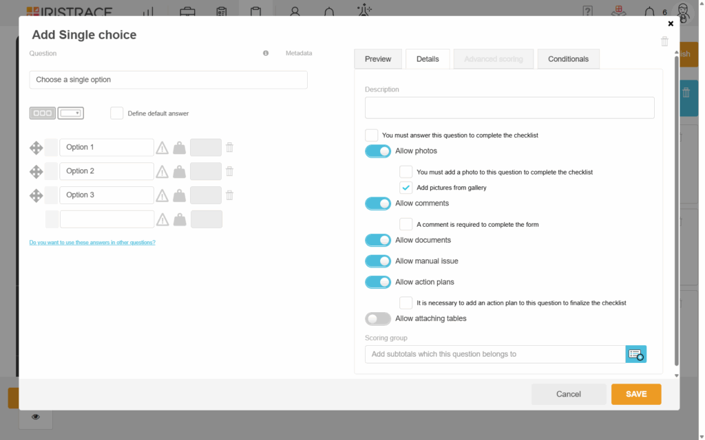 Workflows worden geactiveerd op basis van verschillende voorwaarden, zoals voltooide checklists met problemen, gereedheid voor kwaliteitscontrole, selectieve antwoorden op vragen, behaalde cumulatieve scores en meer.